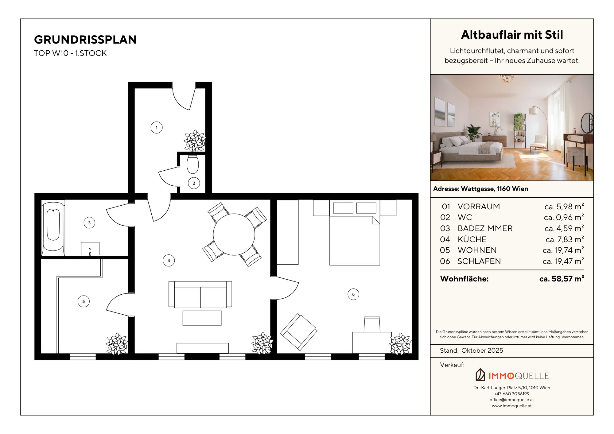 Willkommen in der Wattgasse – und willkommen in einer Wohnung, die den Charme der Stadt mit der Behaglichkeit eines Altbaus vereint. Im ersten Stock eines gepflegten Wiener Hauses öffnet sich diese rund 58 m² große 2-Zimmer-Wohnung zur südöstlichen Morgensonne – mit einem Grundriss, der durchdacht, wohnlich und effizient zugleich ist.