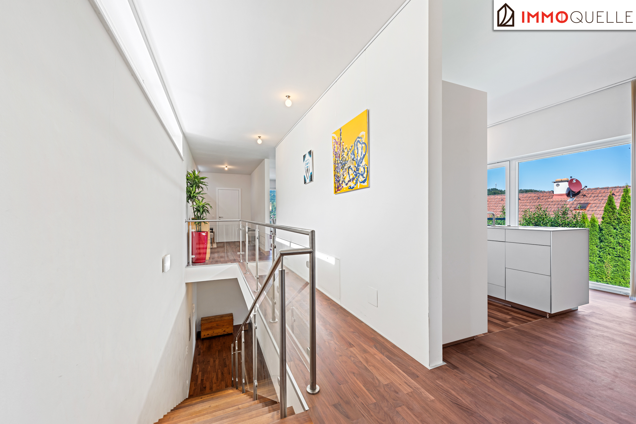 Ein besonderes Potenzial schlummert auf dem Dach: Das fast 90 m² große Flachdach ist bereits für den Ausbau zu einer spektakulären Dachterrasse vorbereitet. Bodenverankerung, Strom-, Wasser- und Lichtanschlüsse sind bereits vorhanden und warten nur darauf, diesen Ort in eine atemberaubende Sky-Lounge mit 360-Grad-Blick zu verwandeln.