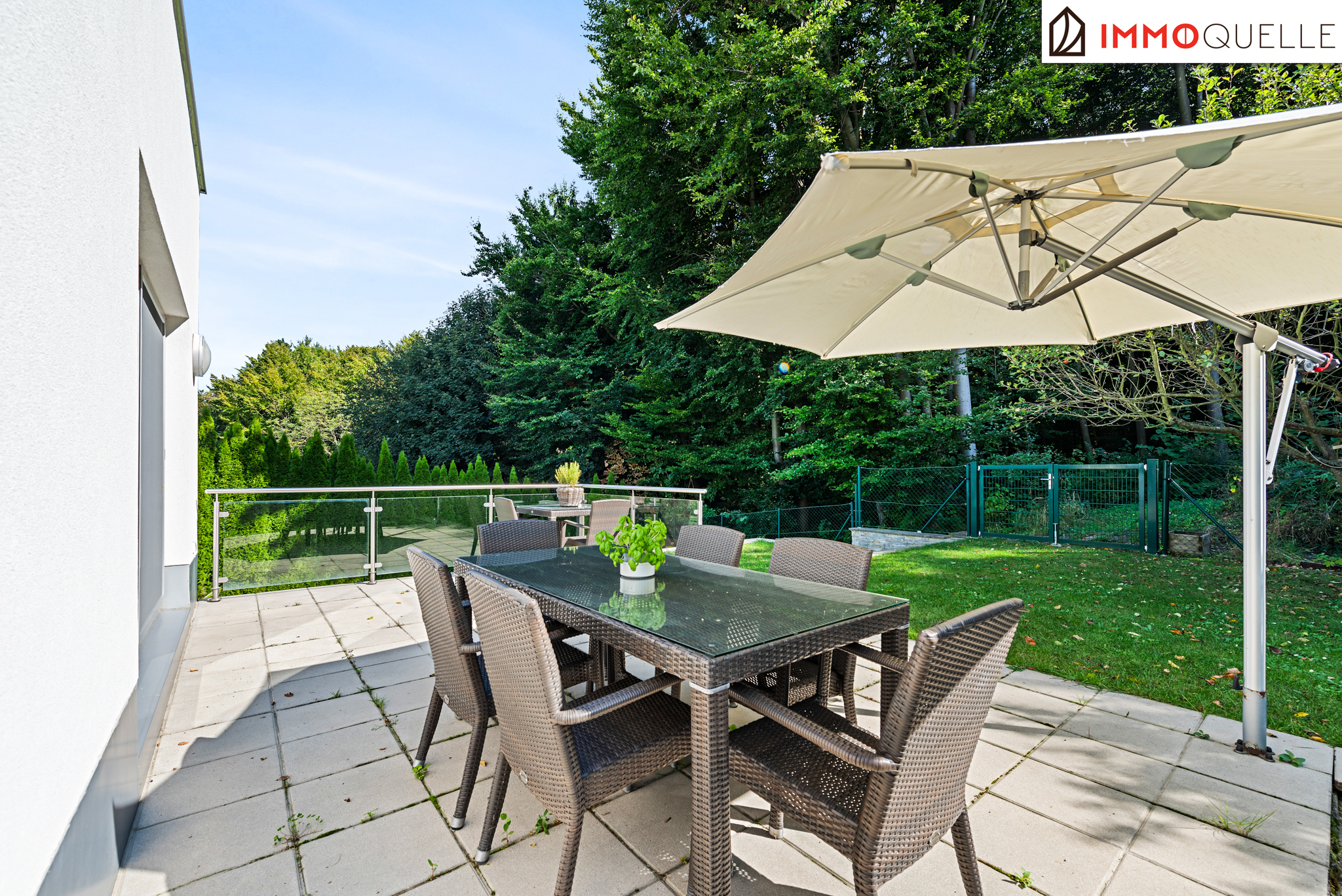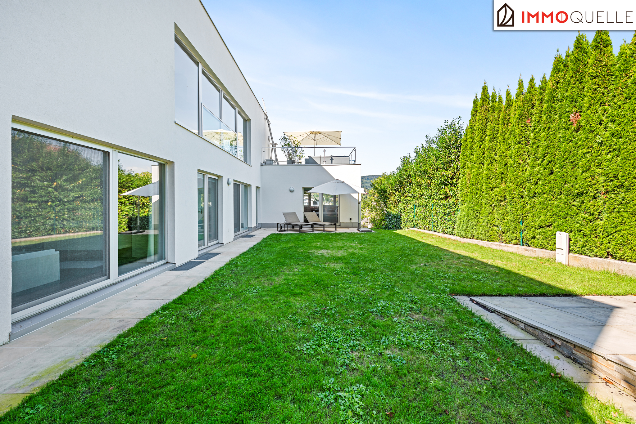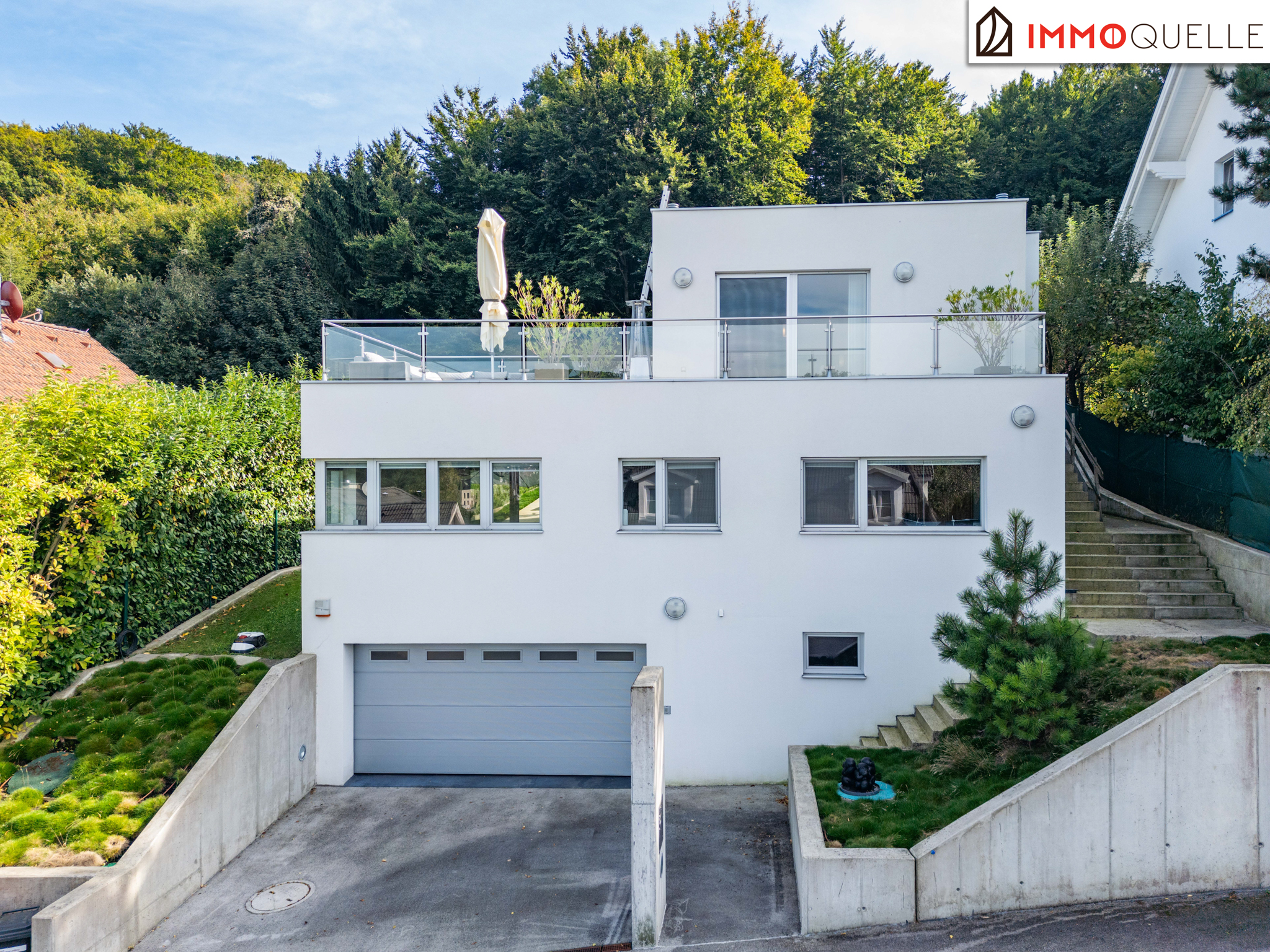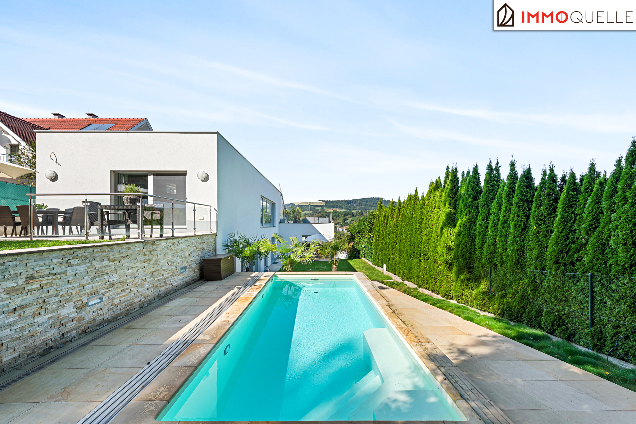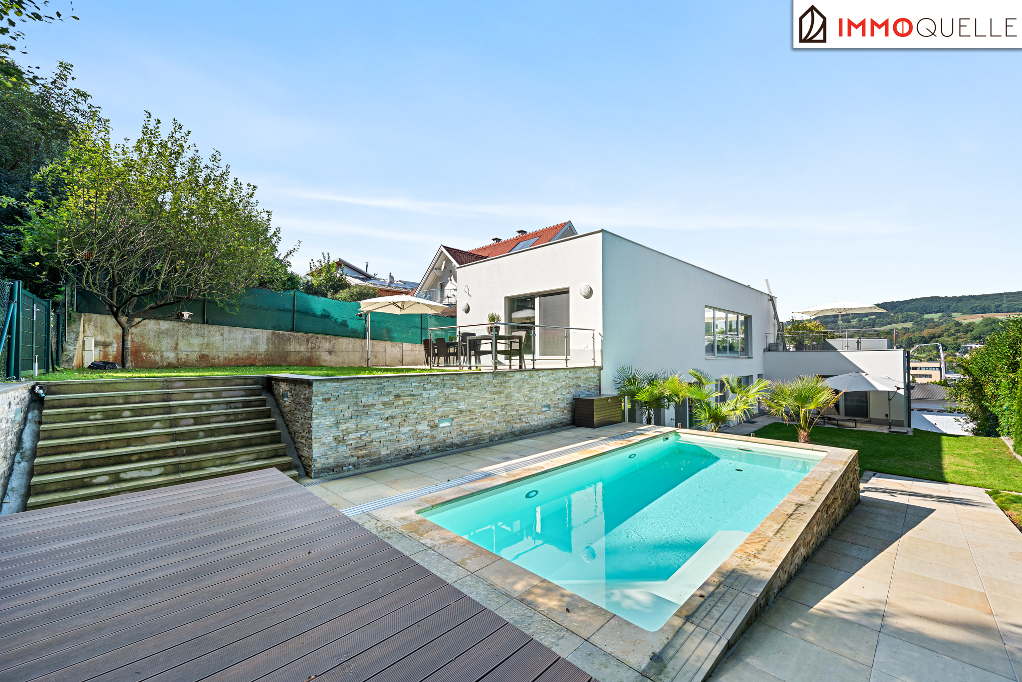 Die Liegenschaft grenzt direkt an den Wald und bietet somit eine absolute Privatsphäre und einen unbezahlbaren Erholungswert. Der Garten wurde bewusst wartungsarm gestaltet, mit zwei Mährobotern und einer automatischen Bewässerungsanlage. Das Highlight im Außenbereich ist der 3x7 Meter große beheizte Salzwasser-Pool mit Gegenstromanlage, umgeben von einer eleganten Sonnenterrasse aus Natur-Sandstein. Drei große Palmen verleihen dem Garten ein mediterranes Flair, während diverse Terrassen rund um das Haus zu jeder Tageszeit den perfekten Platz an der Sonne oder im Schatten bieten.