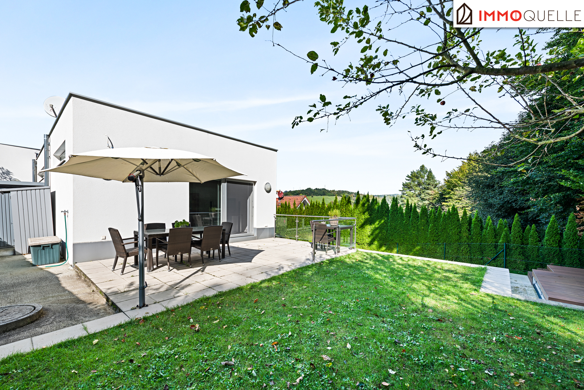 - Mehrere Sonnenterrassen rund ums Haus – Sonne & Schatten zu jeder Tageszeit