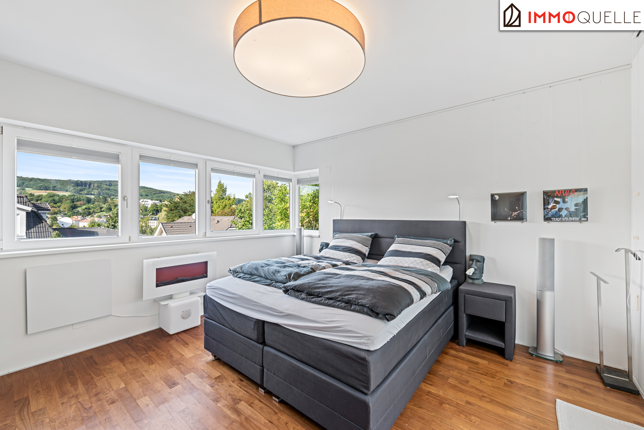 Der moderne und kubische Entwurf des Hauses besticht durch eine intelligente Raumaufteilung, die sowohl repräsentative Offenheit als auch private Rückzugsorte meisterhaft vereint. Das Herzstück bildet die oberste Etage mit einer beeindruckenden Raumhöhe von 2,90 Metern. Hier verschmelzen Wohnen, Essen und Kochen zu einem spektakulären, lichtdurchfluteten Raumkontinuum. Der edle, geölte amerikanische Nussbaum-Parkettboden, der sich durch die meisten Wohnräume zieht, und die durchgehende Fußbodenheizung schaffen eine warme, einladende Atmosphäre. An kühleren Abenden spendet der offene Spartherm-Kamin mit seiner großen Glaskeramikscheibe behagliche Wärme und wird zum zentralen Treffpunkt für die ganze Familie.