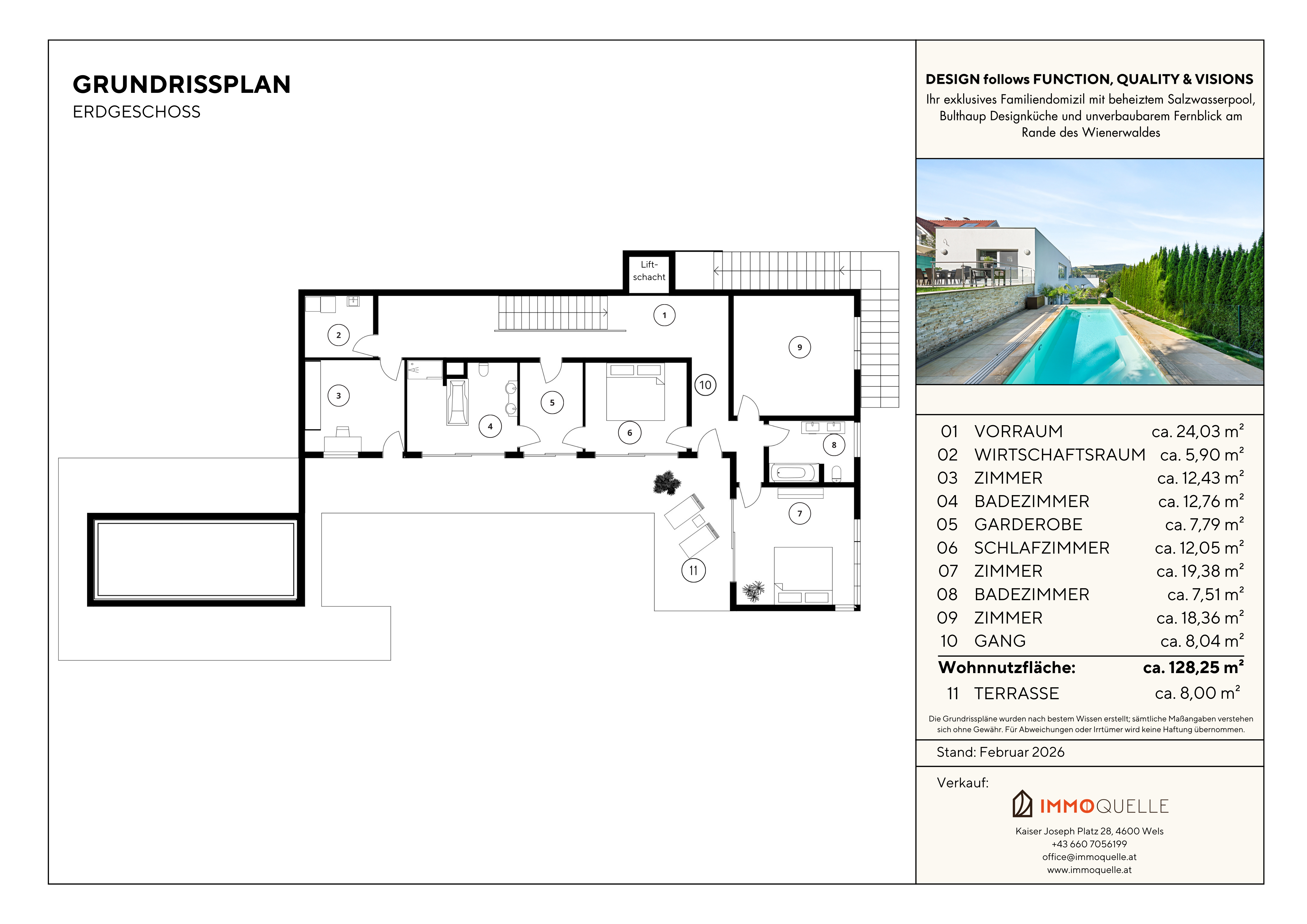 Das mittlere Geschoss ist der privaten Entspannung gewidmet. Eine durchdachte „Eltern-Unit“ verbindet Schlafzimmer, eine begehbare Garderobe und ein luxuriöses Bad en suite zu einem harmonischen Ganzen, ohne einen Korridor betreten zu müssen. Von hier aus gelangen Sie auf kurzem Weg zum beheizten Salzwasser-Pool – ein Sprung ins kühle Nass vor dem Frühstück wird zum täglichen Ritual. Ein lichtdurchflutetes Arbeitszimmer mit direktem Terrassenzugang bietet den idealen Rückzugsort für konzentriertes Arbeiten von zu Hause. Zwei weitere großzügige Zimmer mit einem separaten, ebenso hochwertig ausgestatteten Badezimmer bilden den perfekten Bereich für Kinder oder Gäste. Ein praktischer Hauswirtschaftsraum mit Platz für Waschmaschine und Trockner rundet diese Etage ab und erspart das Tragen von Wäsche über mehrere Stockwerke. Alle Sanitärräume glänzen mit Armaturen von Dornbracht und einer exquisiten Materialwahl aus dunklem Natur-Schiefer und deckenhohem Donaukalkstein.