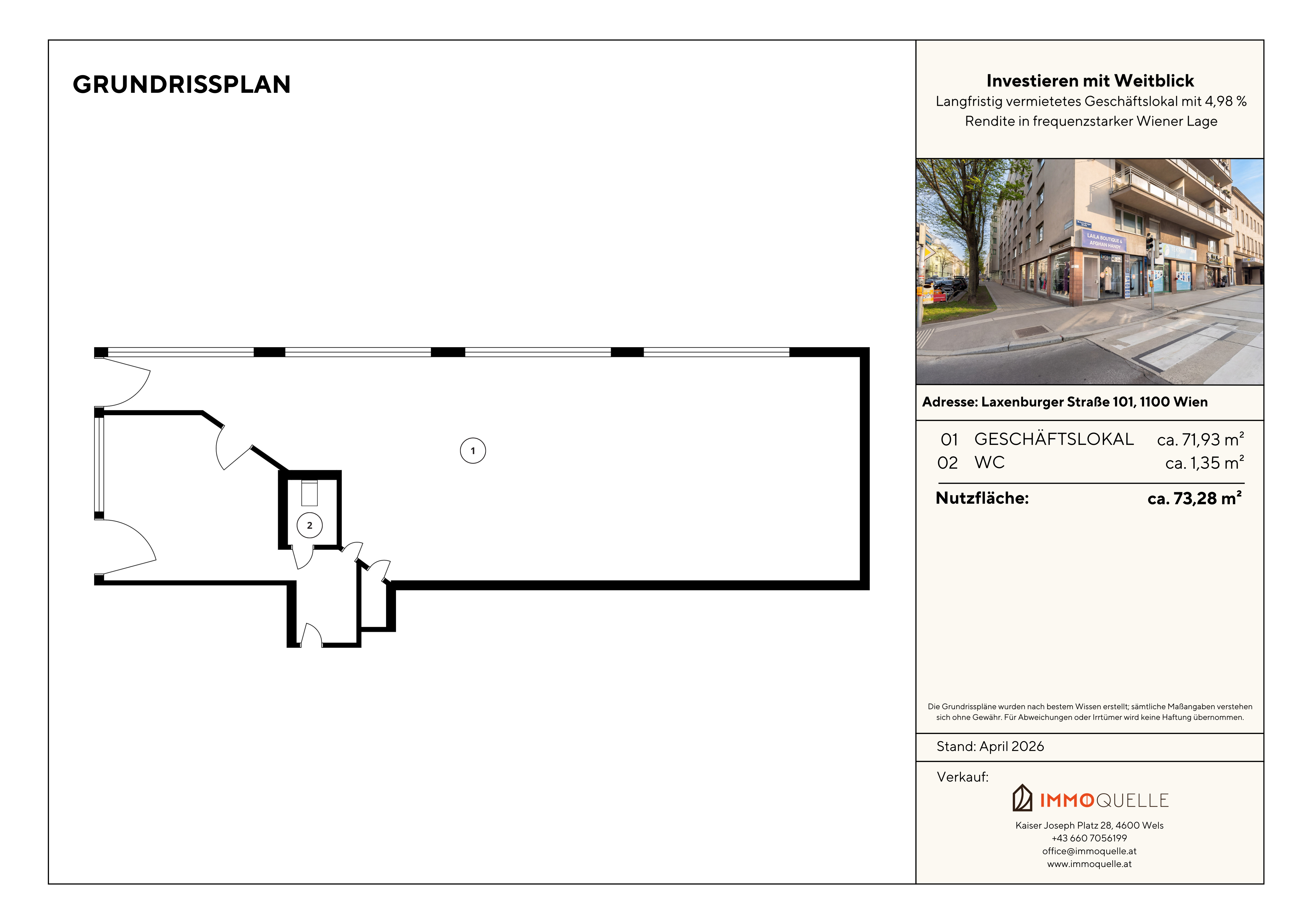 Lage? Die Liegenschaft befindet sich in der Laxenburger Straße 101, 1100 Wien - einer stark frequentierten Verkehrsader mit ausgezeichneter Sichtbarkeit und hervorragender Anbindung. Die Umgebung ist geprägt von einer dichten Wohnbebauung, vielfältigen Gewerbebetrieben sowie einer konstant hohen Passantenfrequenz.